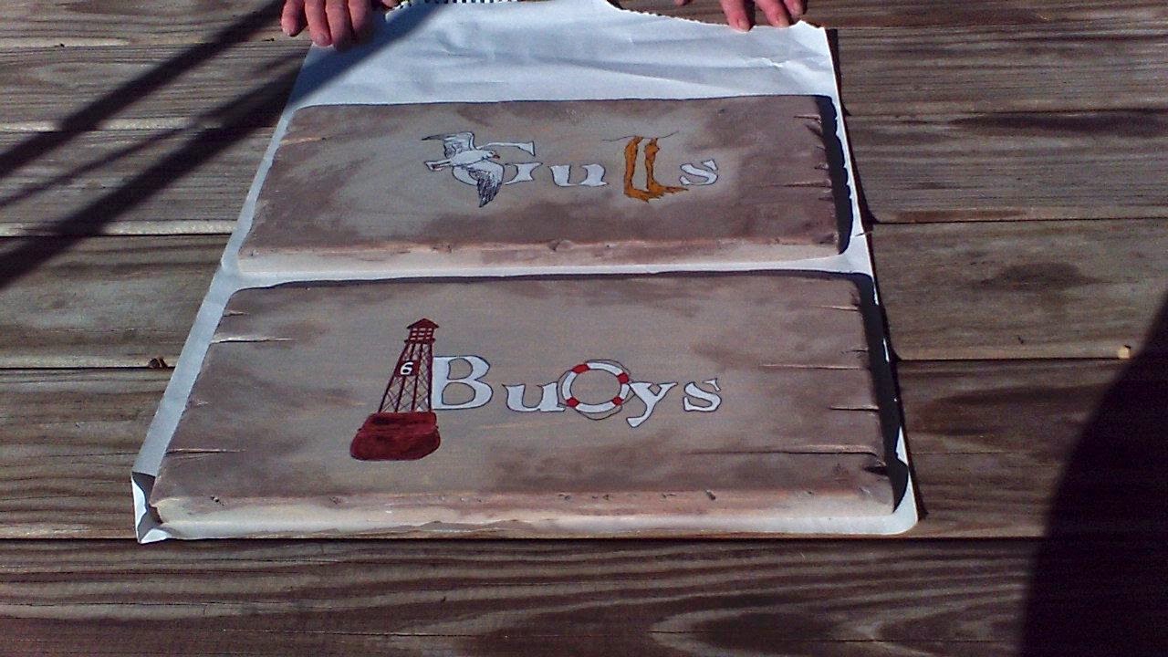 The Marina asked us to do signs for the bathrooms to replace the industrial stick ons they were using. We did a faux distressing on some planking and got fanciful.